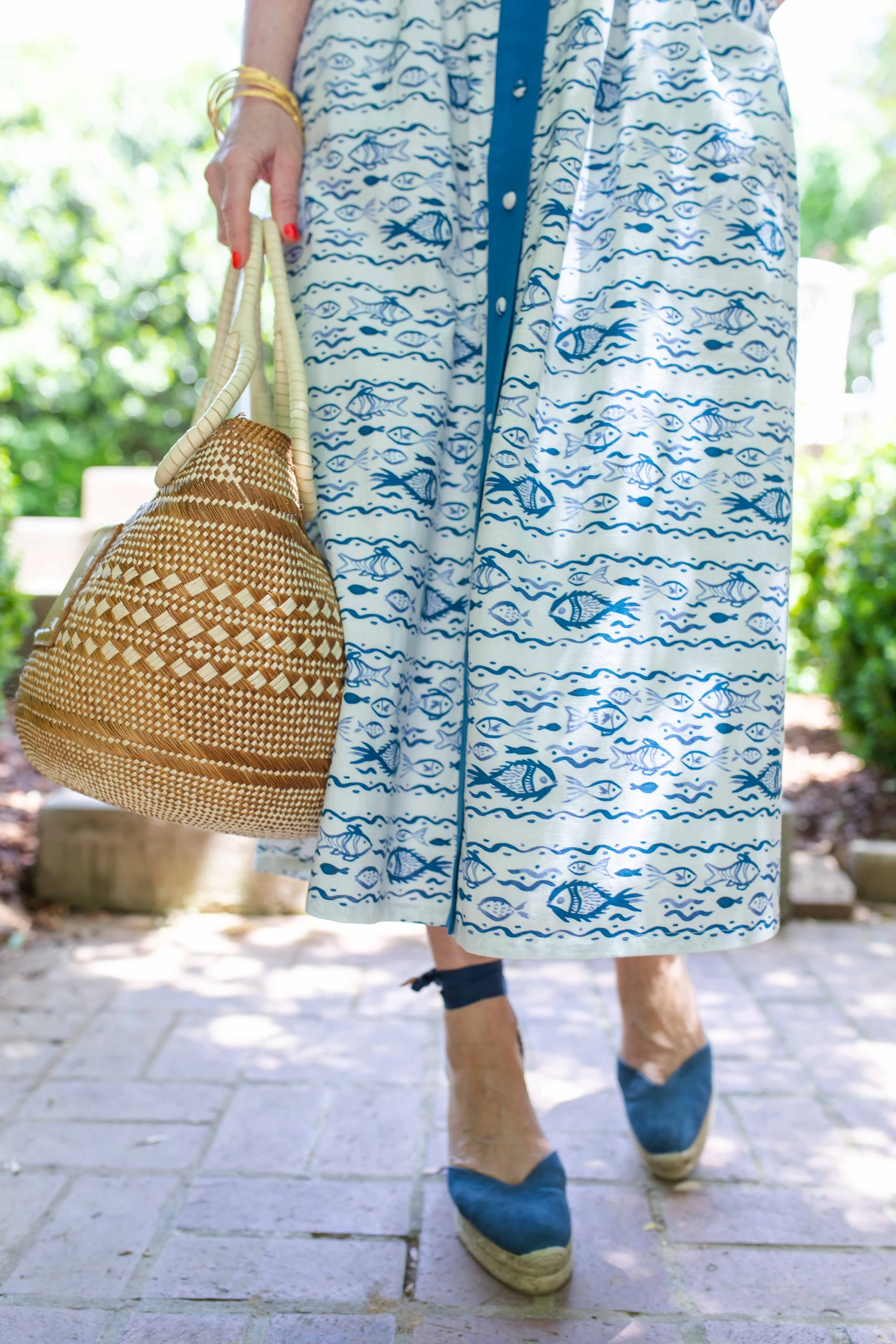 skirt (gifted) / similar shirt / espadrilles / hat (size small here + size large here) / handbag / earrings / bangles / sunglasses / lip color / nail color